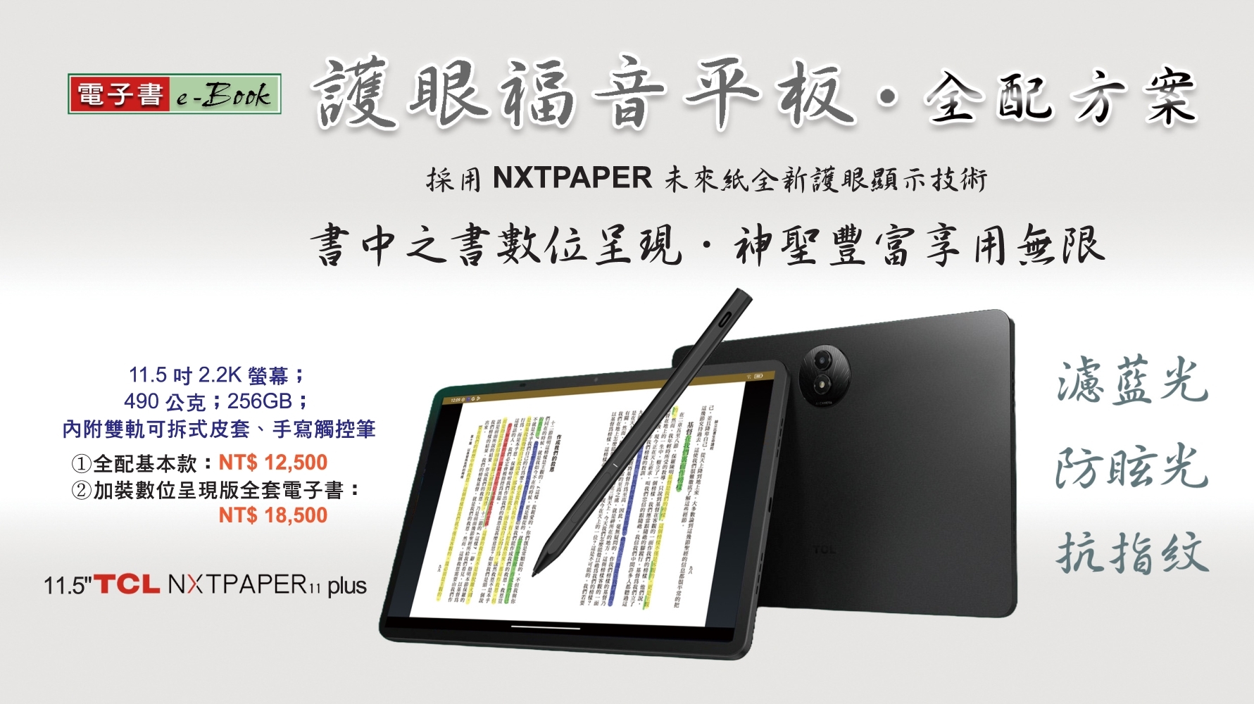 本福音平板全配方案,精挑細選TCL NXTPAPER 11 Plus 全彩護眼平板電腦,隨附雙軌可拆式皮套及T-Pen手寫觸控筆。TCL NXTPAPER 11 Plus 採用開放式Android系統,使用全新護眼顯示技術,具有濾藍光、防眩光、抗指紋等特色,支援標準、彩色紙、墨水紙模式,內建AI智慧助理,相比一般手機平板較適合長時間閱讀。本全配方案代裝Android序號卡優惠組合26套Apps,連同八百本書報、補充包(58本書)等超值內容。代裝讀墨Readmoo APP,建議加購福音暢讀一年分序號,兌換後可暢讀李常受文集、生命讀經及高峰研讀電子版。盼望藉此工具輔助,使我們有更多機會被主話中神聖的真理構成。