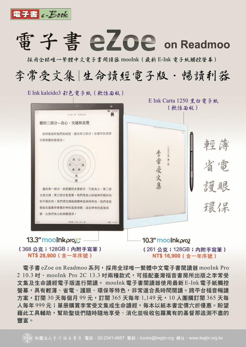 電子書eZoe on Readmoo系列,方案七採用全球唯一繁體中文電子書閱讀器moolnkPro 2(10.3吋黑白電子紙-軟性面板),內附EMR電磁式手寫筆1支與筆芯,含讀墨福音暢讀一年,可閱讀臺灣福音書房所出版之李常受文集及生命讀經電子版。