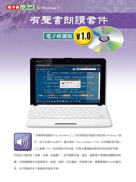 『有聲書朗讀套件 for Windows 7』乃針對最新的視窗作業系統Windows 7設計,向下支援Vista及XP。整合最新Text-to-Speech(TTS)文字轉語音技術、人工智慧(AI)自然語意分析技術,亦整合臺灣福音書房特有的破音字庫。可設定三種角色(男聲、女聲、兒童聲),並可調整音量、速度。搭配電子研讀版相關應用 軟體,可朗讀繁簡中文聖經經文、註解、詩歌、生命讀經、倪柝聲文集、屬靈書報約10,000篇信息;亦可雲端同步下載最新的破音字庫。